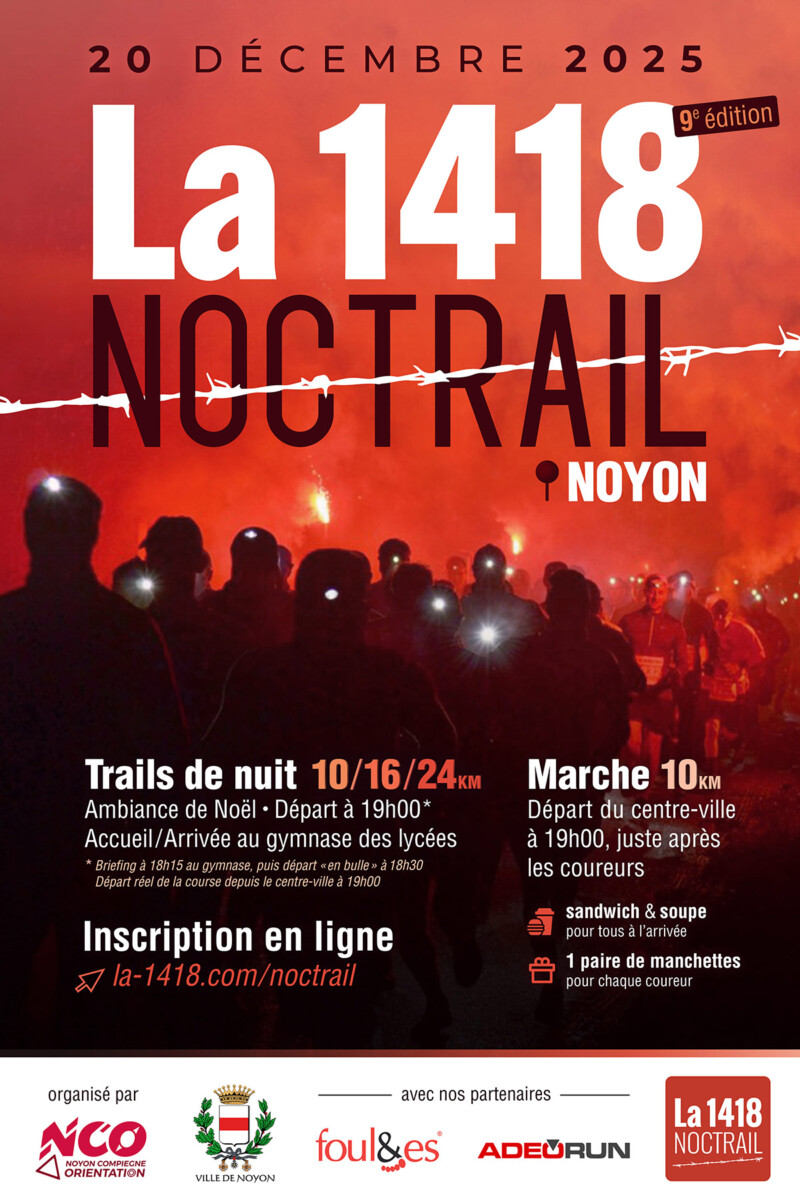 Le Noctrail est une course de nuit sans obstacle (un trail nocturne) organisée à Noyon le samedi 20 décembre 2025 : une ambiance à la fois fun et sportive, avec un soupçon d’esprit de Noel. Course limitée à 1000 participants !
